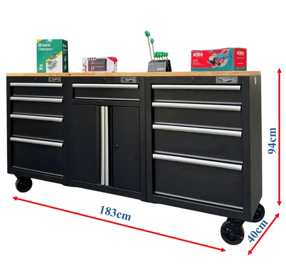 Set of 3 CSPS 183cm black tool cabinets with wooden panel - 09 drawers (white handle)