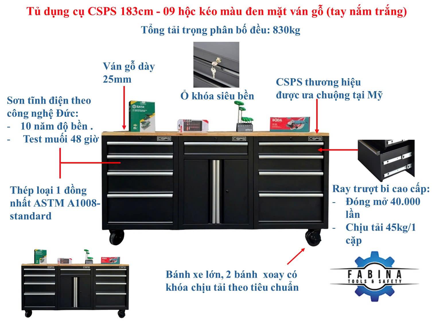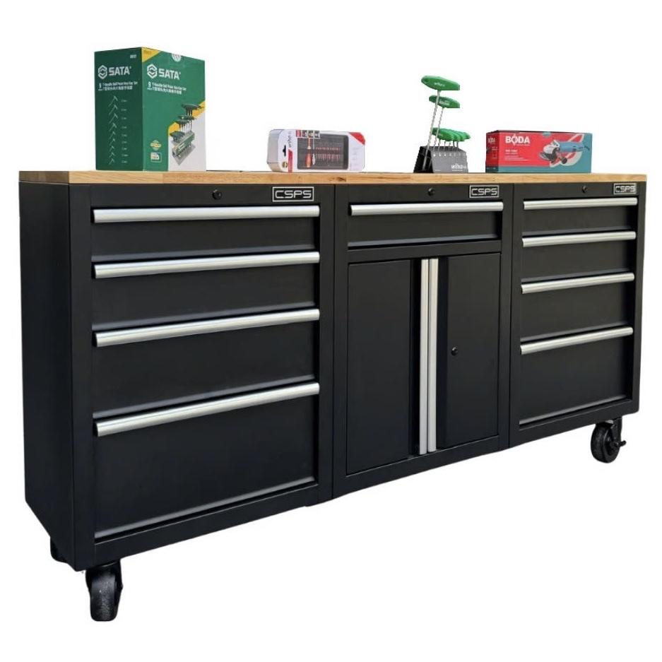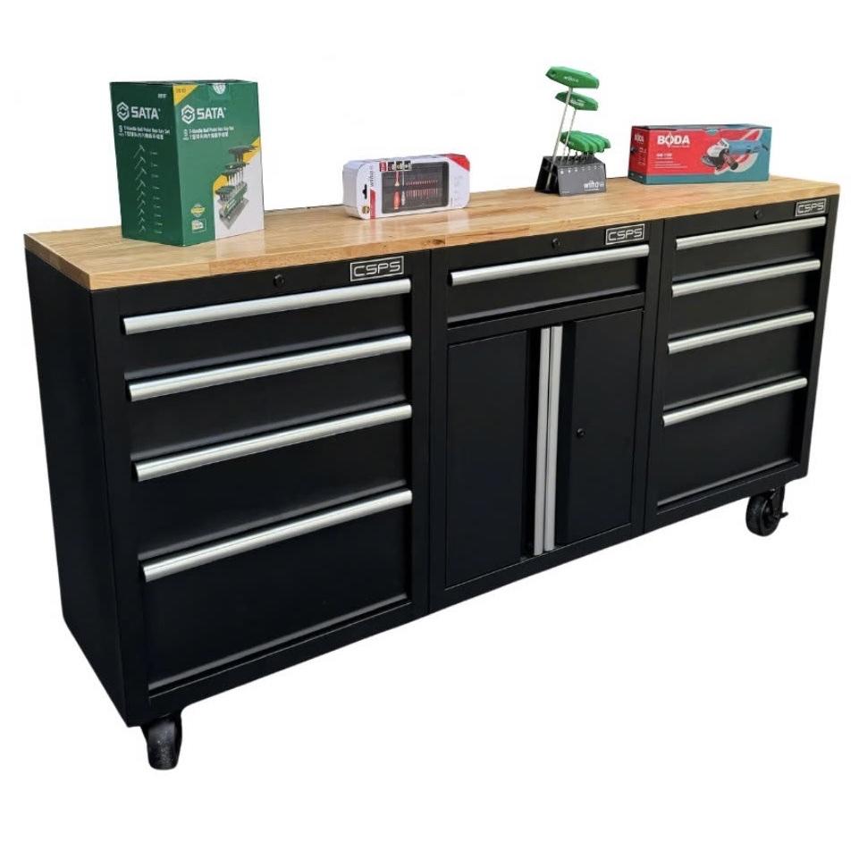 Tủ dụng cụ CSPS 183cm - 09 hộc kéo màu đen mặt ván gỗ (tay nắm trắng)