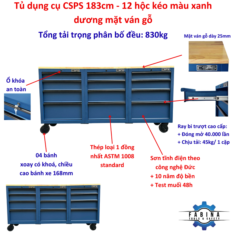 CSPS 183cm Blue tool cabinets with wooden top - 12 drawers