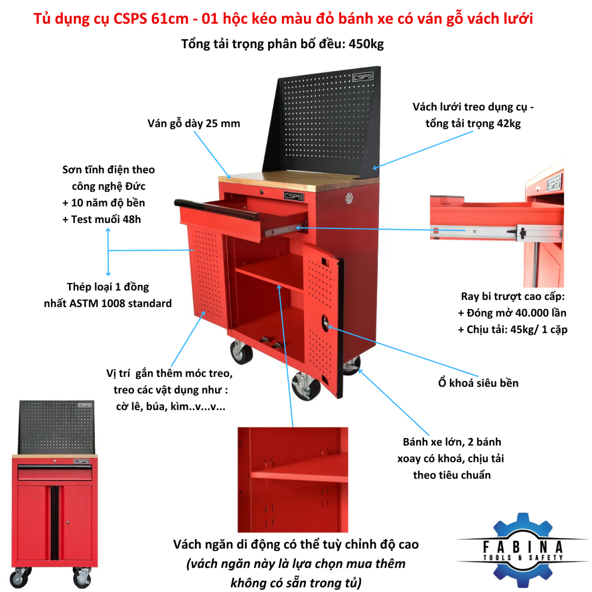 CSPS Red Tool Cabinet 61cm – 1 Drawer with mesh wall