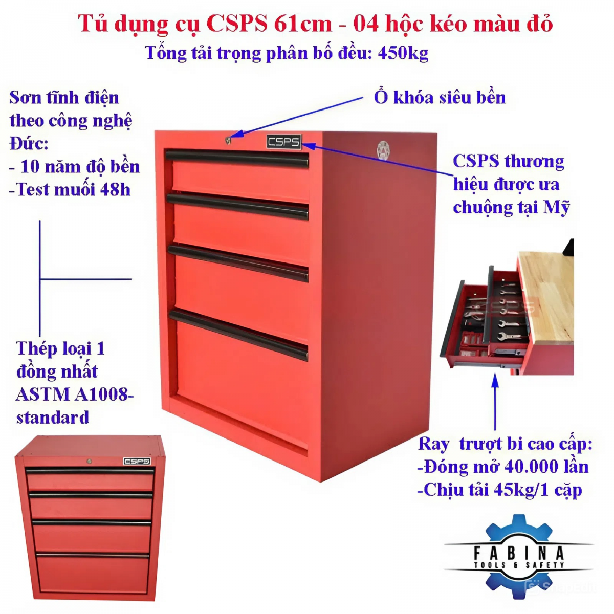 CSPS Matt Red tool cabinet 61cm - 04 drawers
