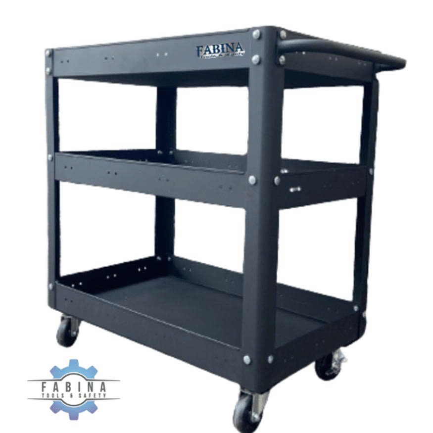 Hình ảnh: Một mẫu xe đẩy Fabina 3 tầng (xám đen) không khóa – phù hợp cho xưởng cơ khí hay gara sửa chữa.