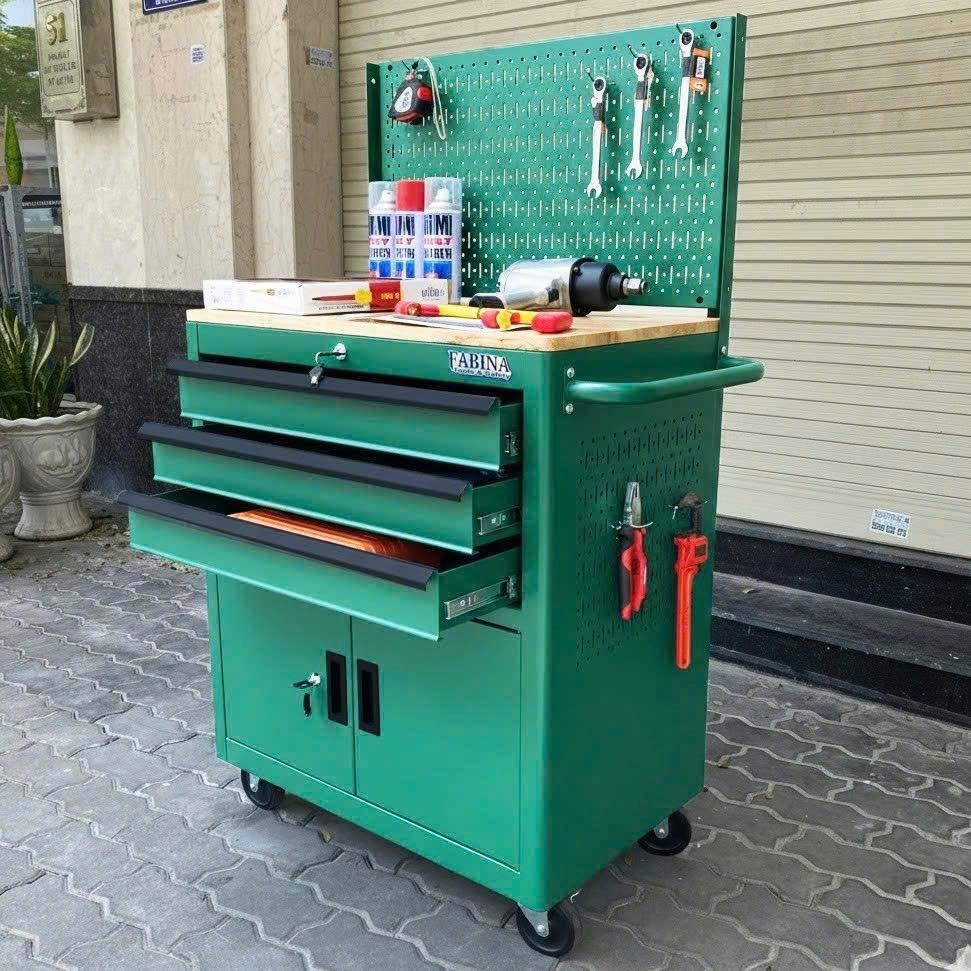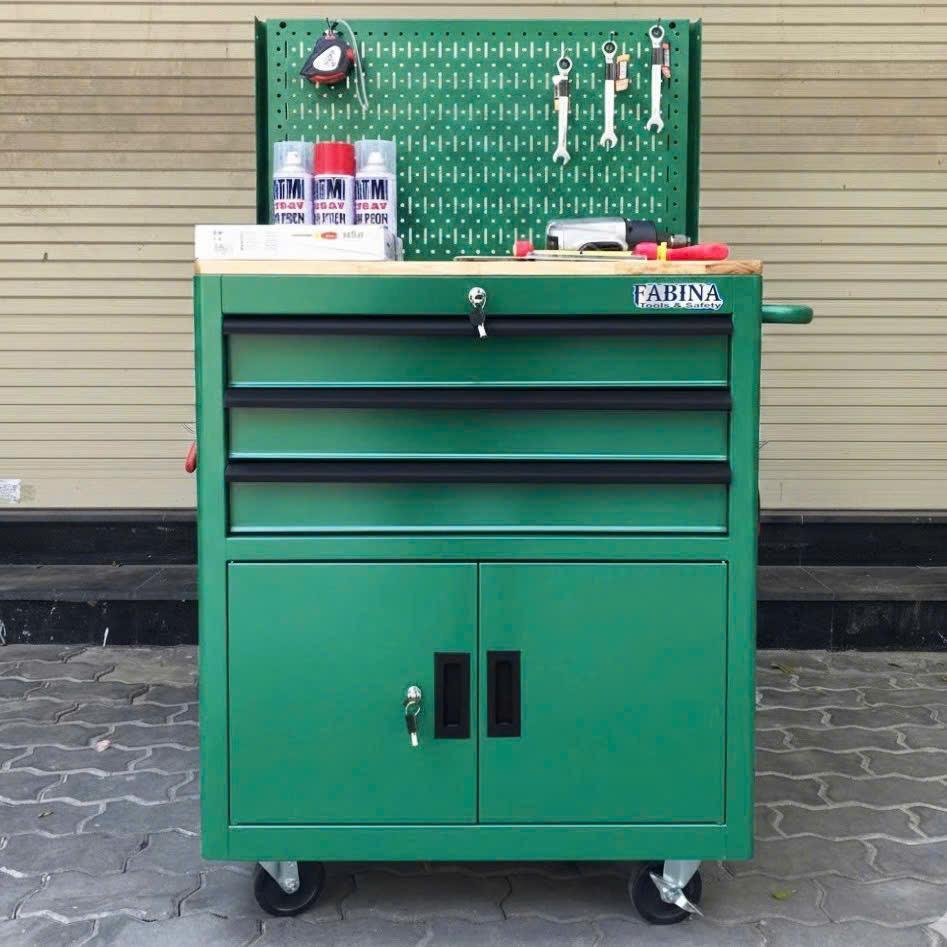 Tủ dụng cụ 3 hộc kéo 2 ngăn chứa màu xanh lá kèm vách lưới Fabina