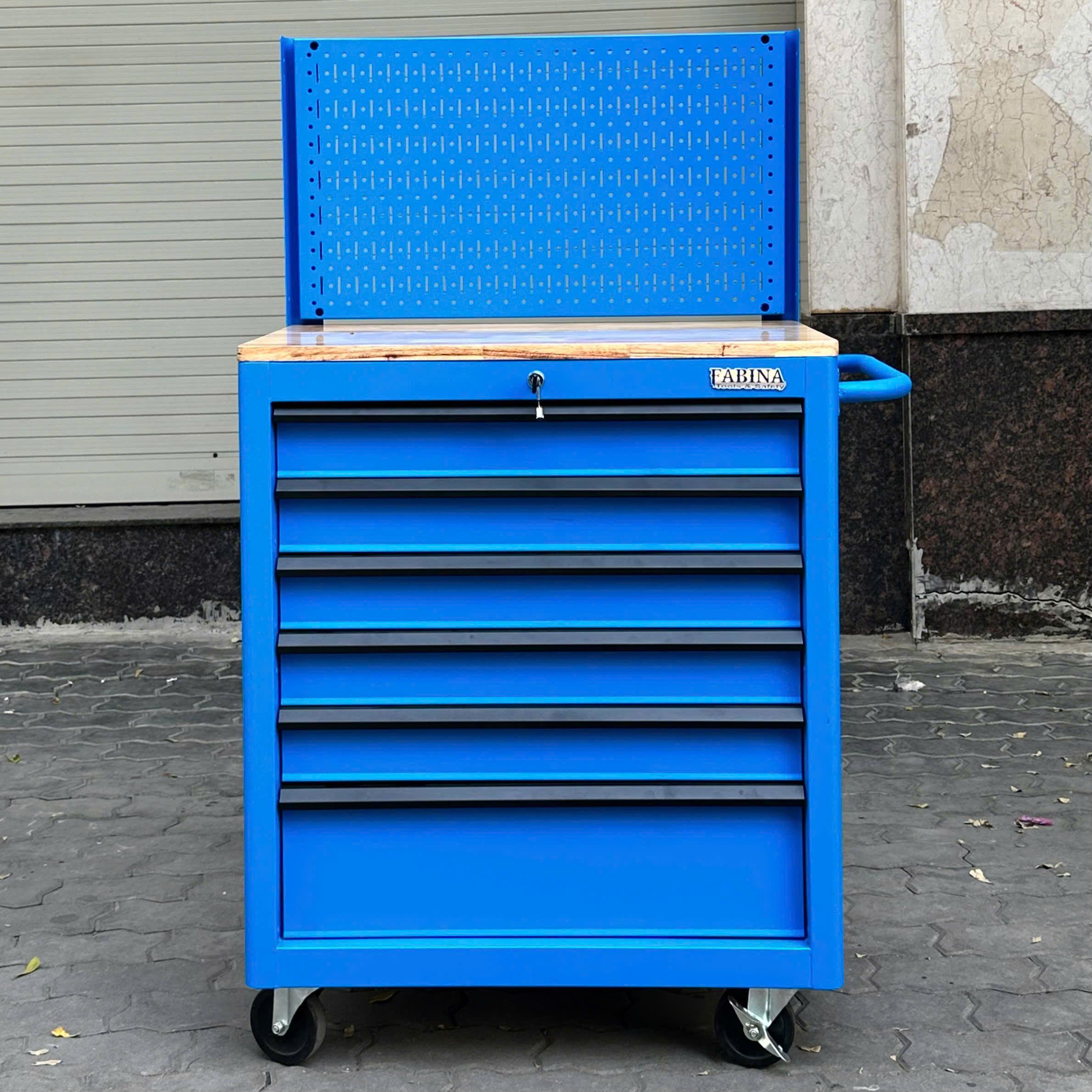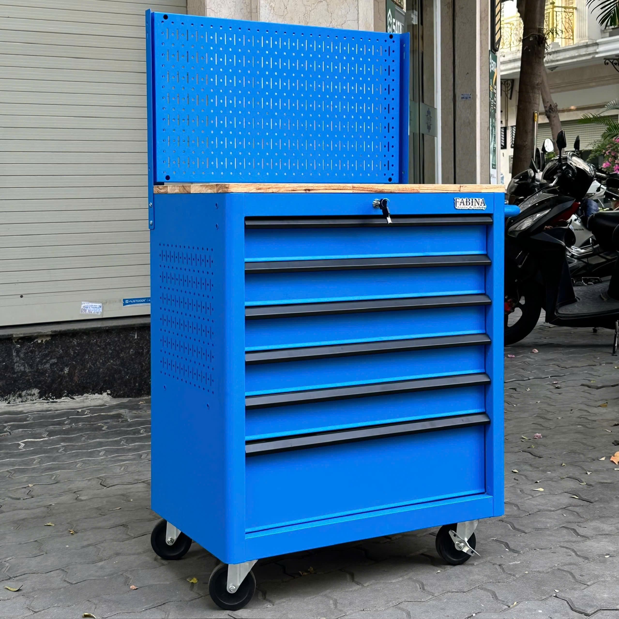 Tủ dụng cụ 6 hộc kéo màu xanh dương kèm vách lưới Fabina