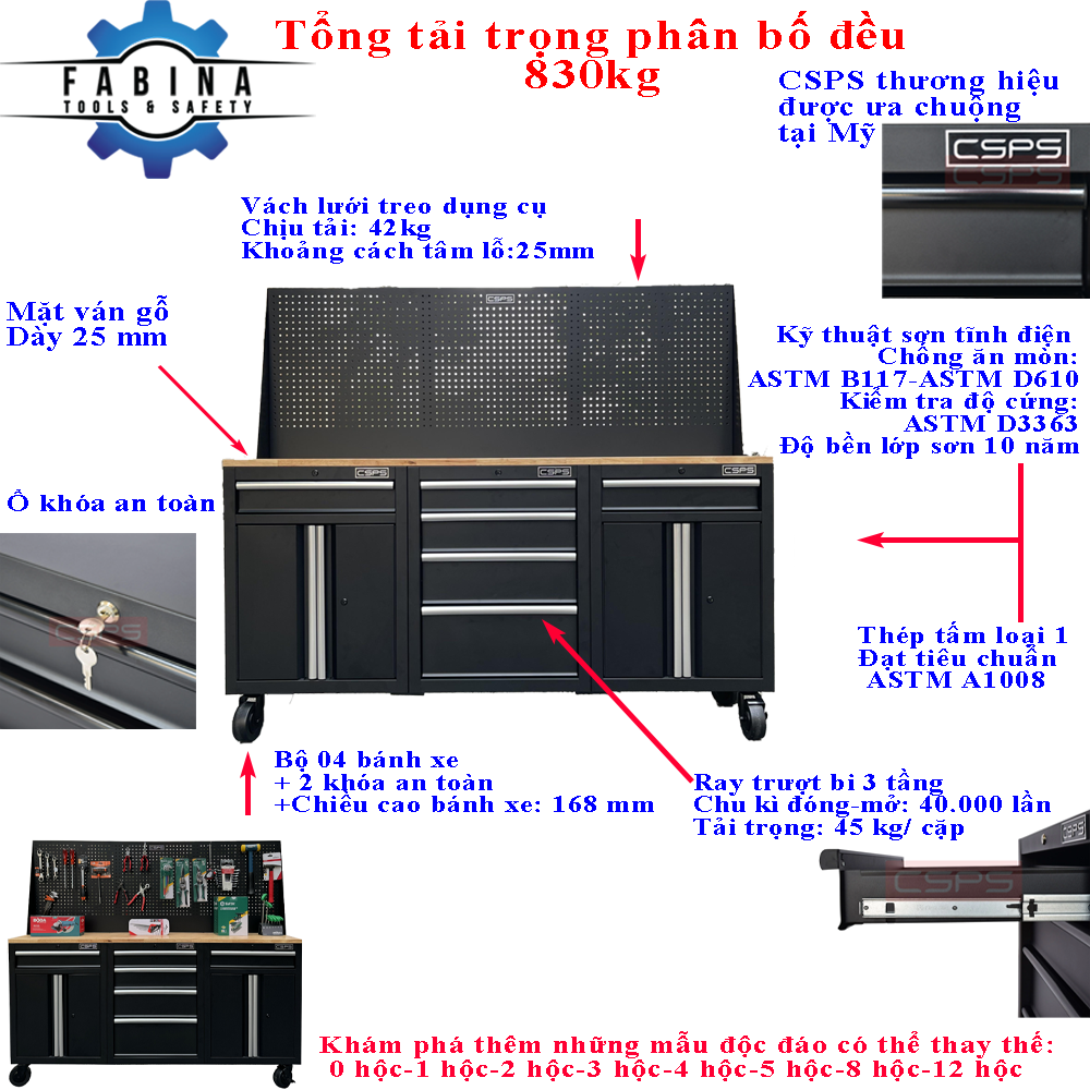 Bộ 3 Tủ dụng cụ CSPS 183cm màu đen mặt ván gỗ kèm vách lưới - 06 hộc kéo (tay cầm trắng)