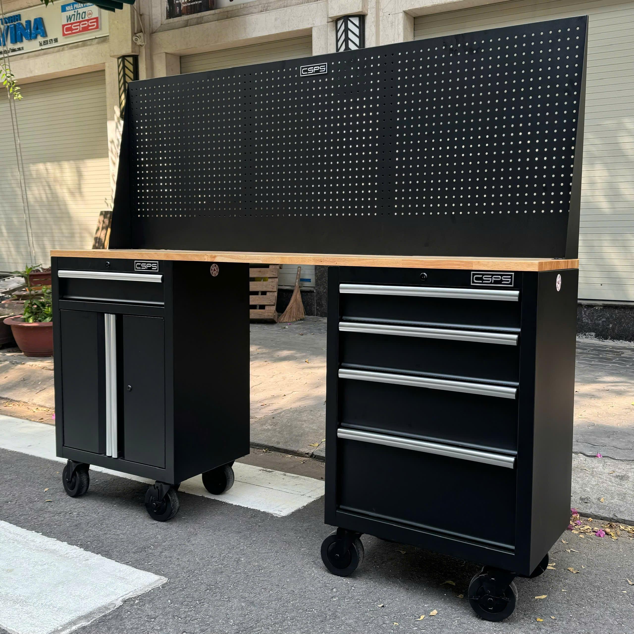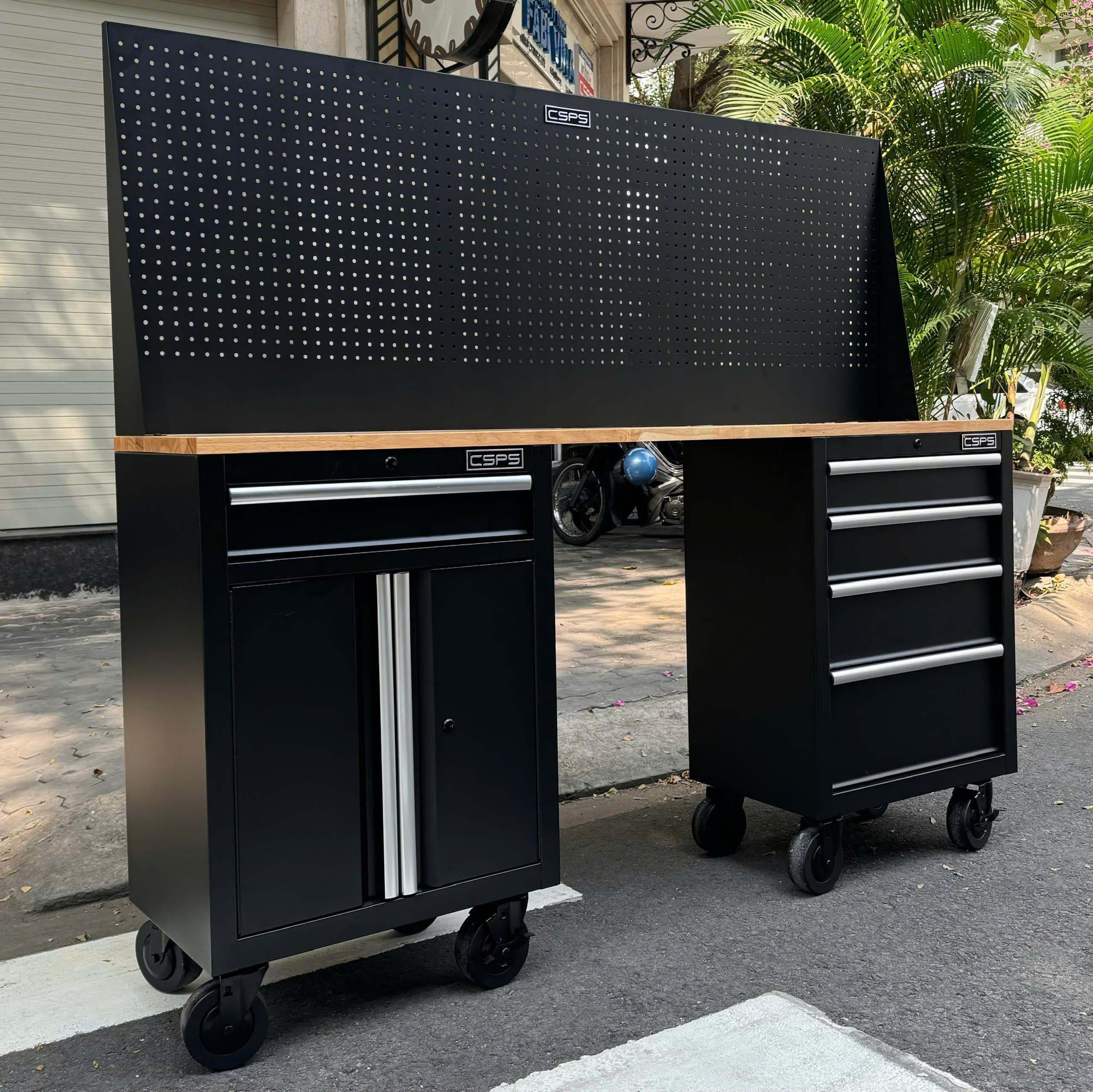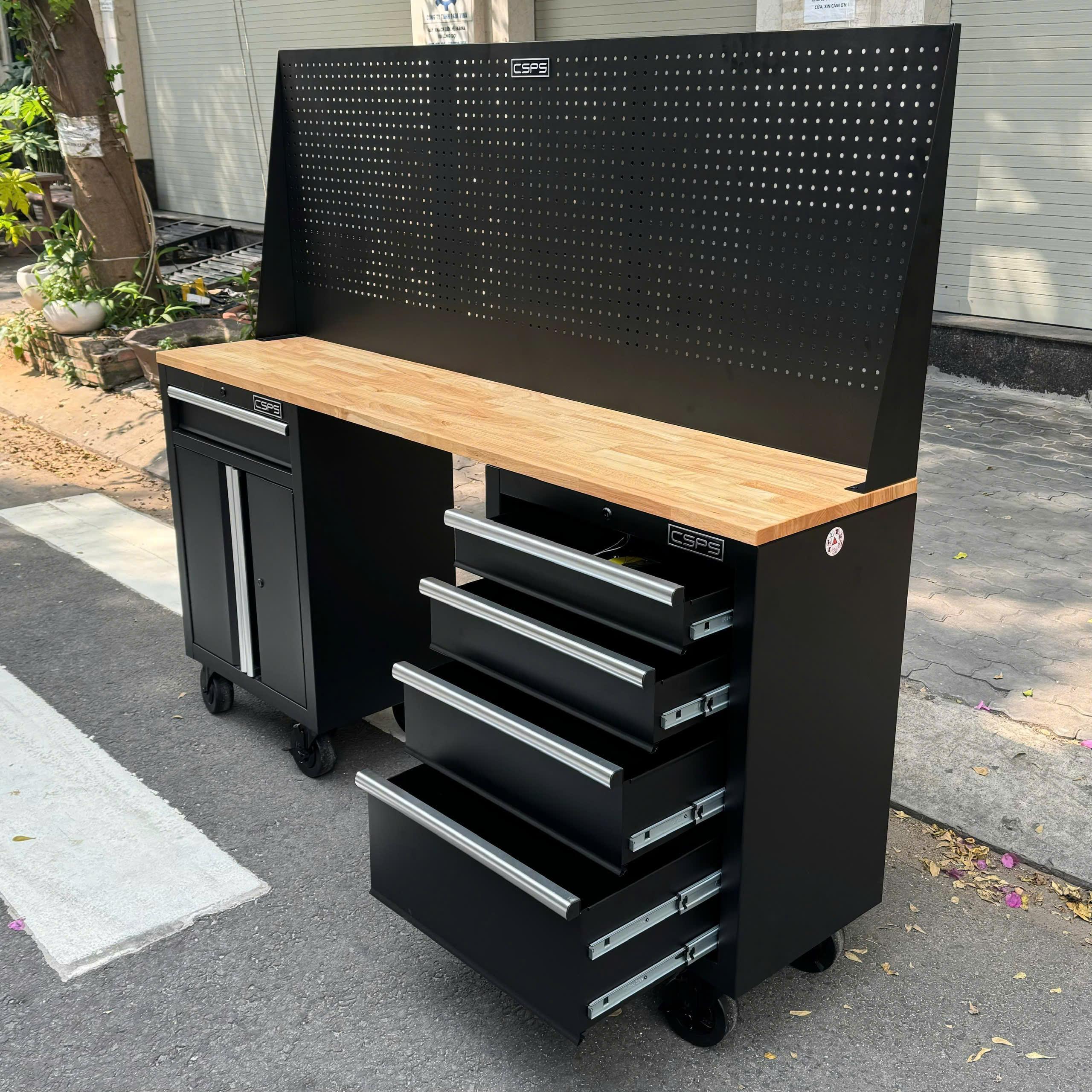 Bộ bàn nguội CSPS 183cm - 05 hộc kéo màu đen mặt ván gỗ vách lưới kèm bánh xe (tay cầm trắng)