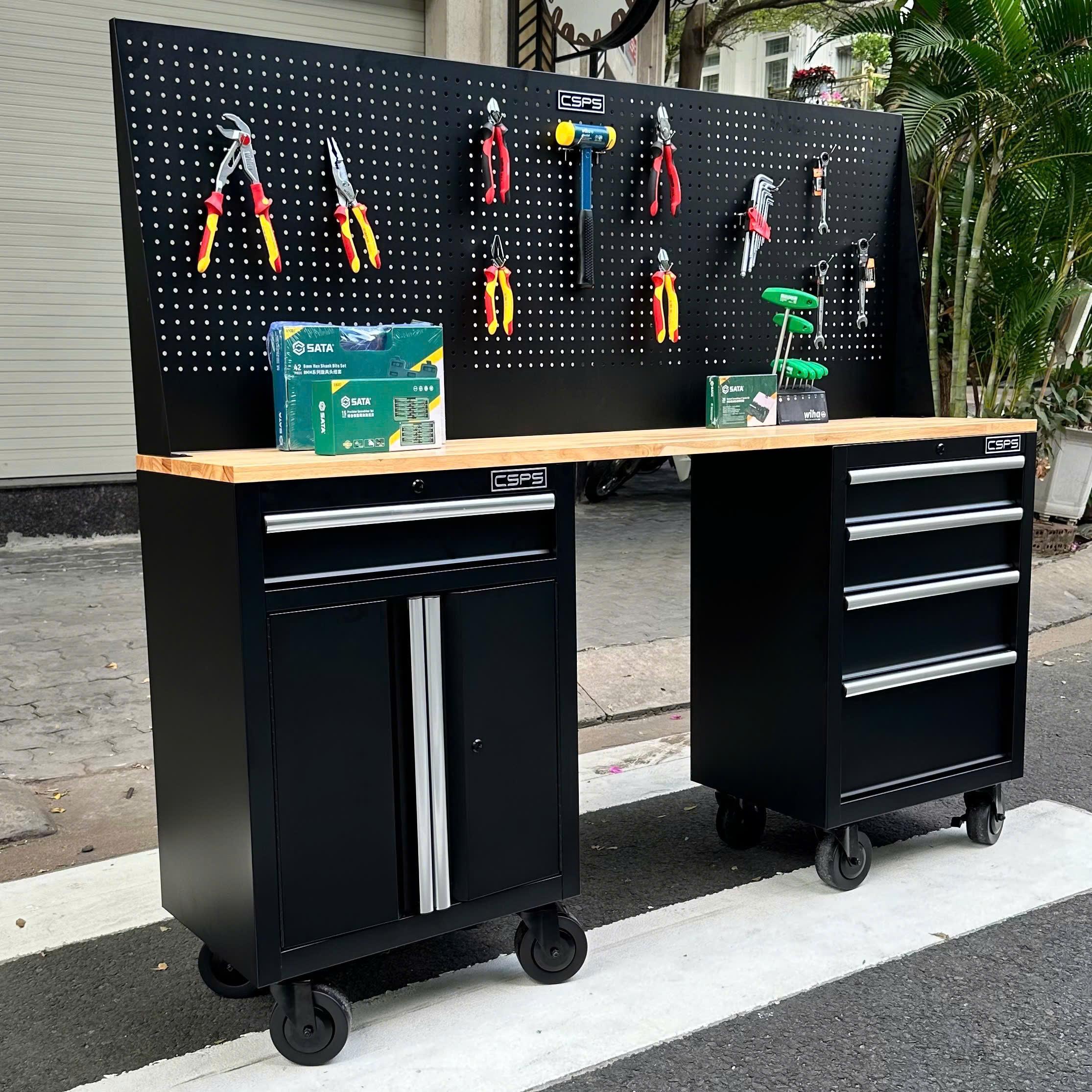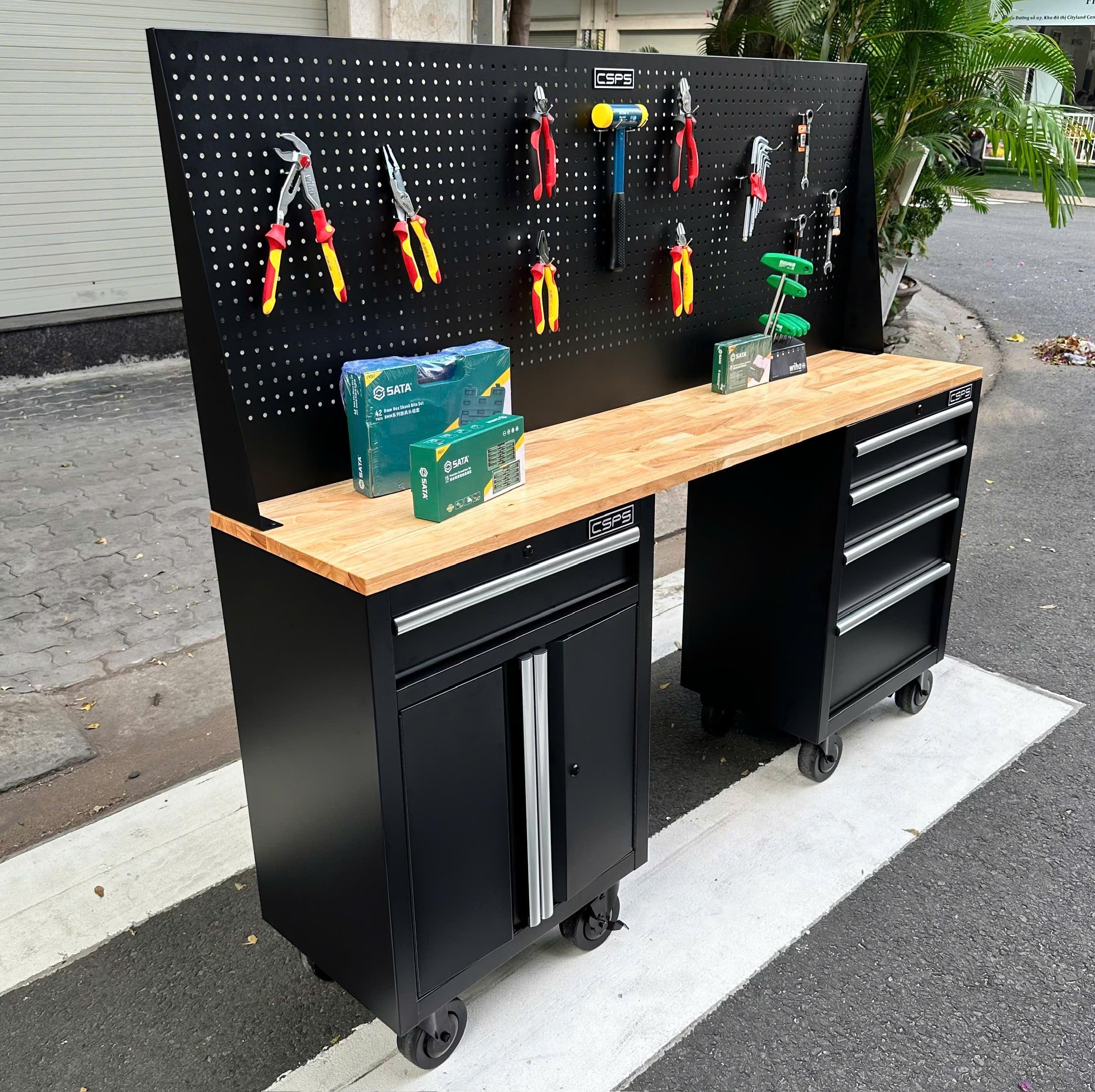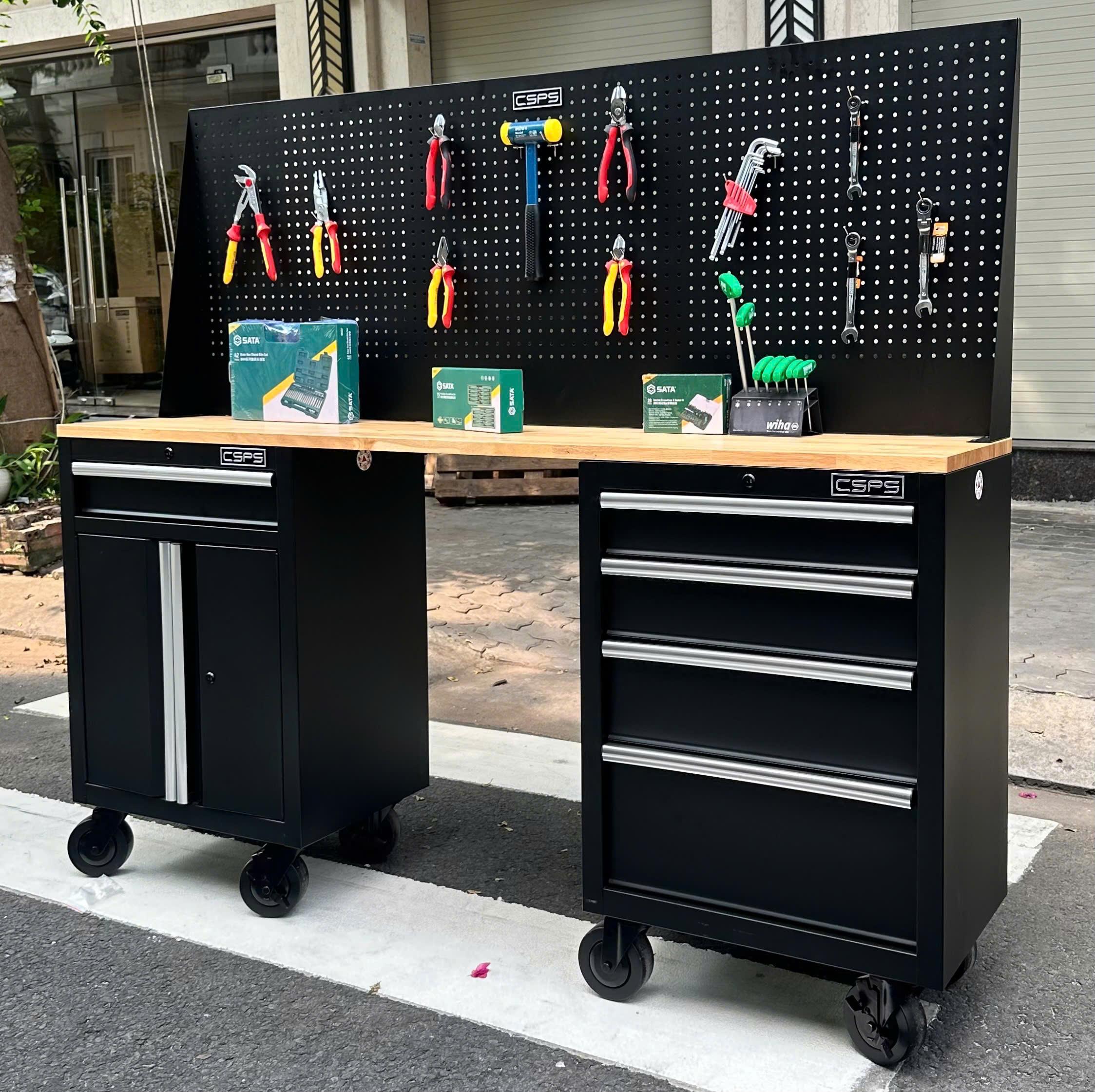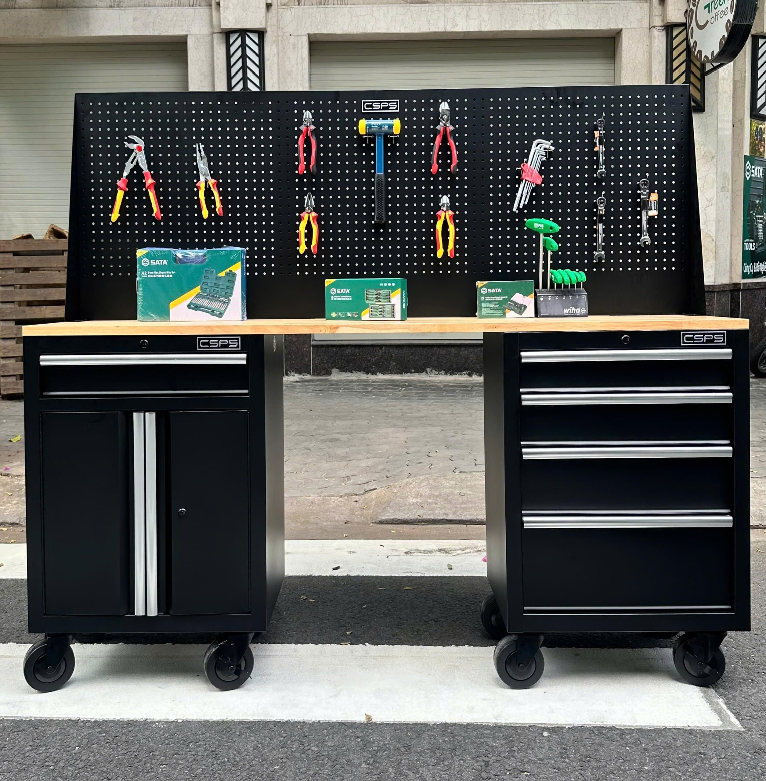 Bộ bàn nguội CSPS 183cm - 05 hộc kéo màu đen mặt ván gỗ vách lưới kèm bánh xe (tay cầm trắng)