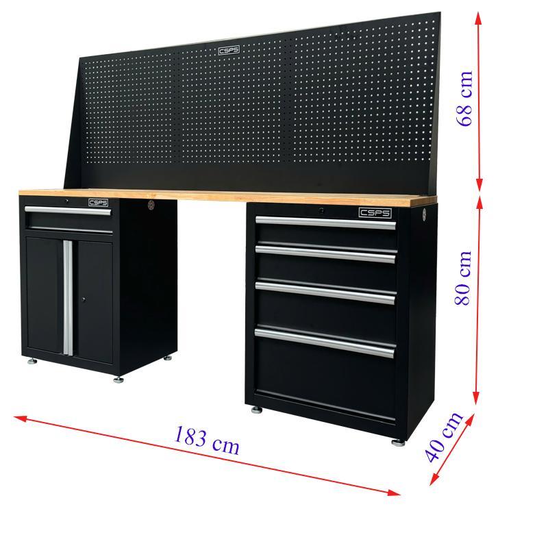 Bộ Bàn Nguội CSPS 183cm - 05 hộc kéo màu đen mặt ván gỗ vách lưới kèm chân tăng chỉnh (tay cầm trắng)