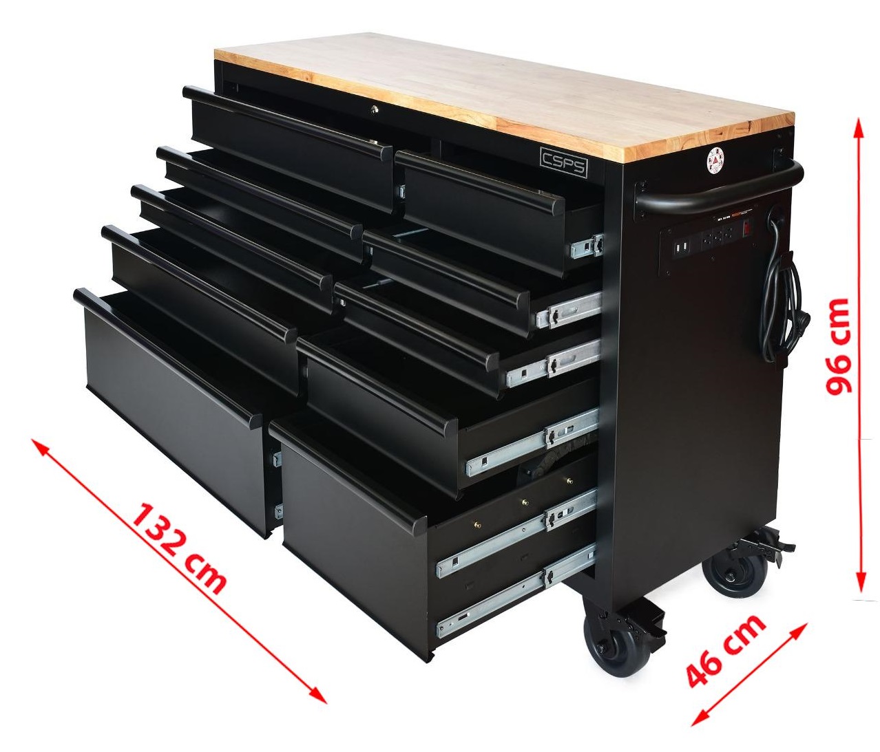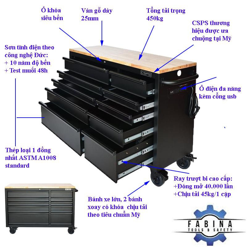 Tủ đồ nghề, tủ dụng cụ CSPS 132cm – 10 hộc kéo. Chứa dụng cụ, đồ nghề, văn phòng phẩm. Tủ di động, phù hợp với nhà máy, garage, cửa hàng, văn phòng. Bảo hành 02 năm. Tiêu chuẩn Mỹ. Sản phẩm của CSPS. Ray trượt bi. Sơn tĩnh điện.