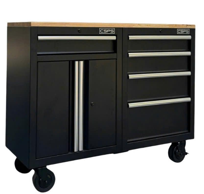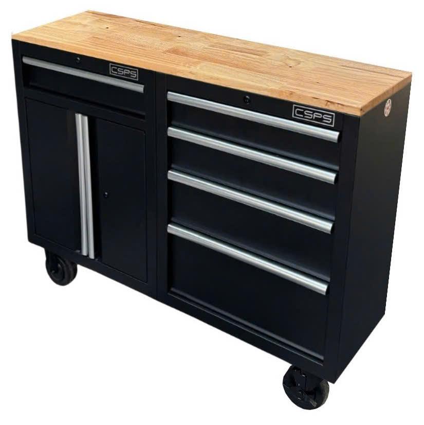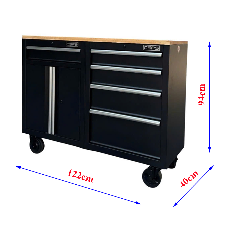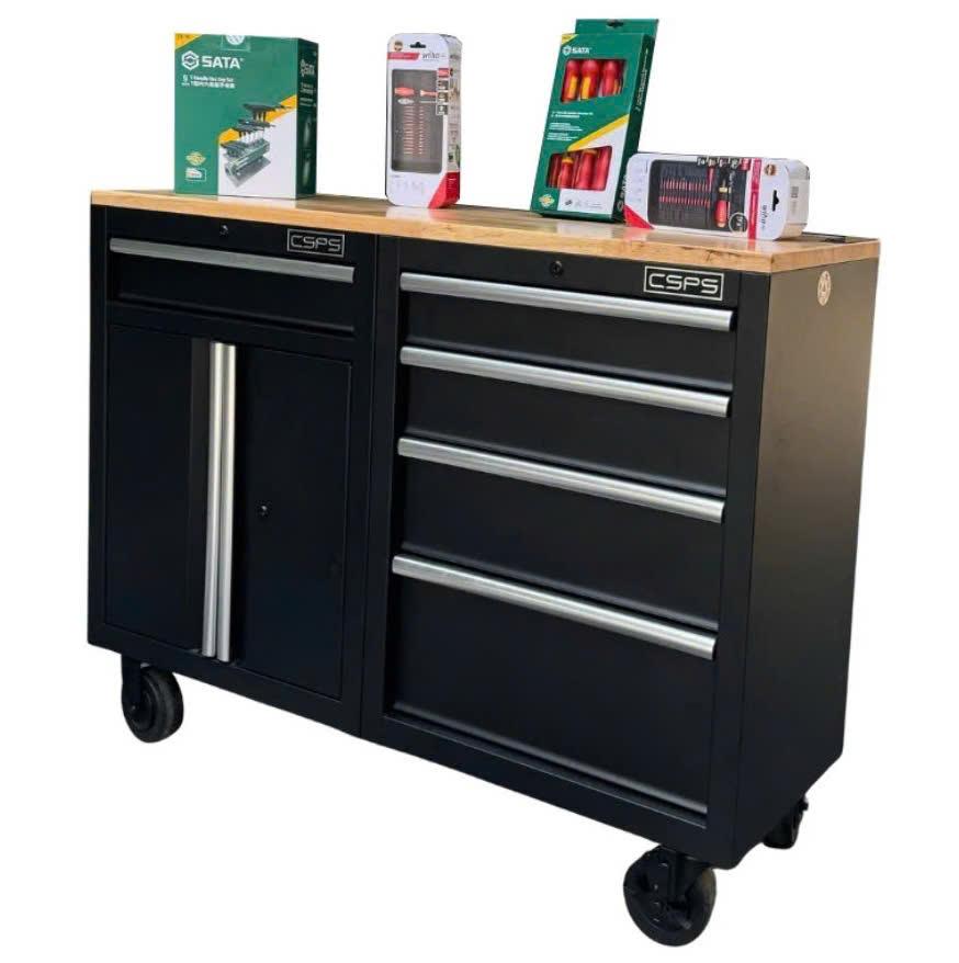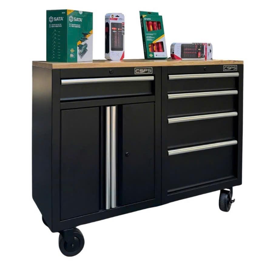 Tủ dụng cụ CSPS 122cm - 05 hộc kéo màu đen mặt ván gỗ (tay cầm trắng)
