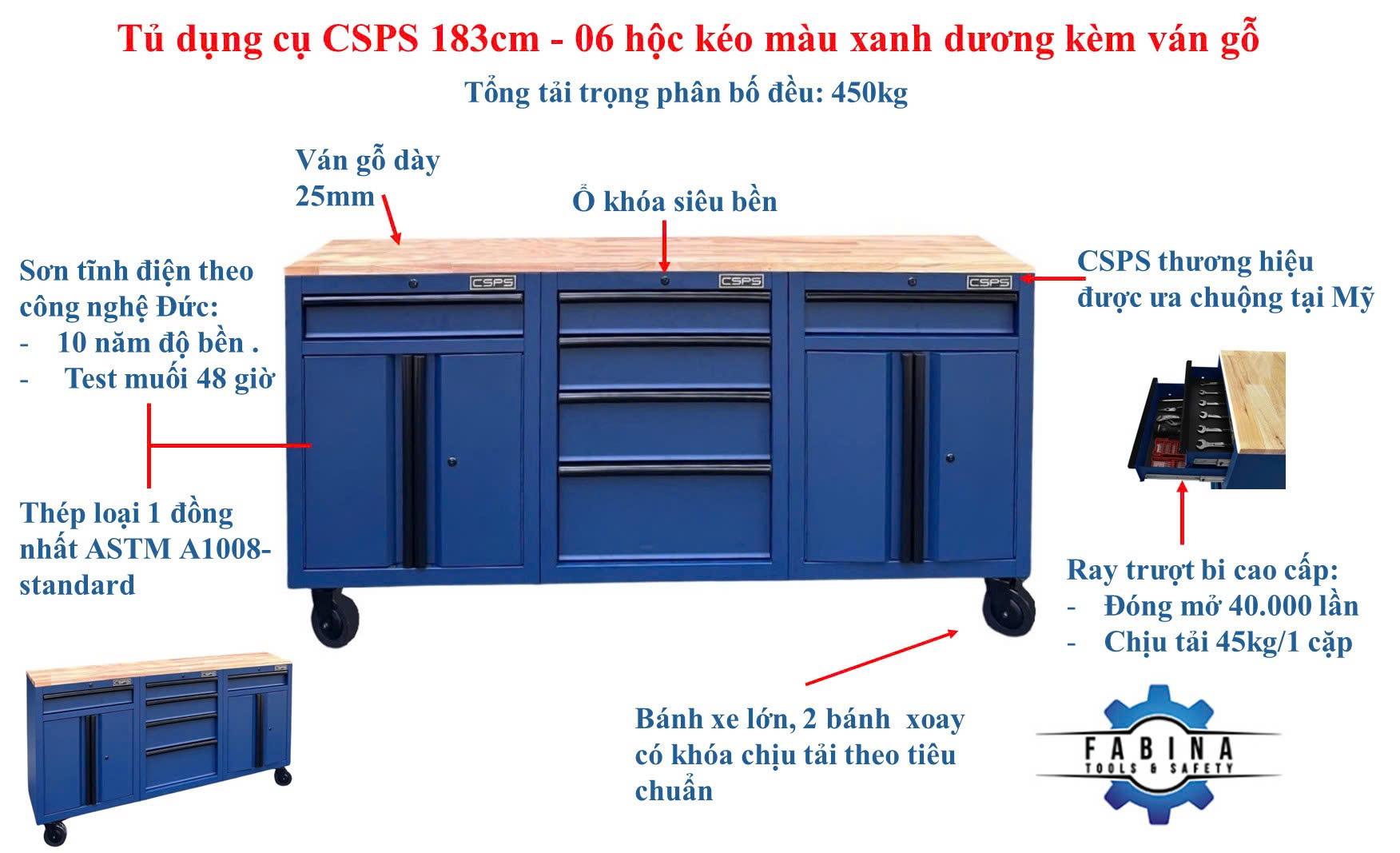 Tủ dụng cụ CSPS 183cm màu xanh dương mặt ván gỗ - 06 hộc kéo