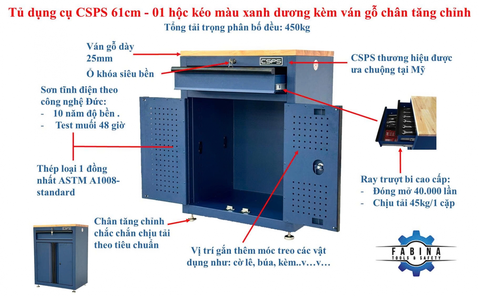Tủ dụng cụ CSPS 61cm - 01 hộc kéo màu xanh dương kèm ván gỗ và chân tăng chỉnh