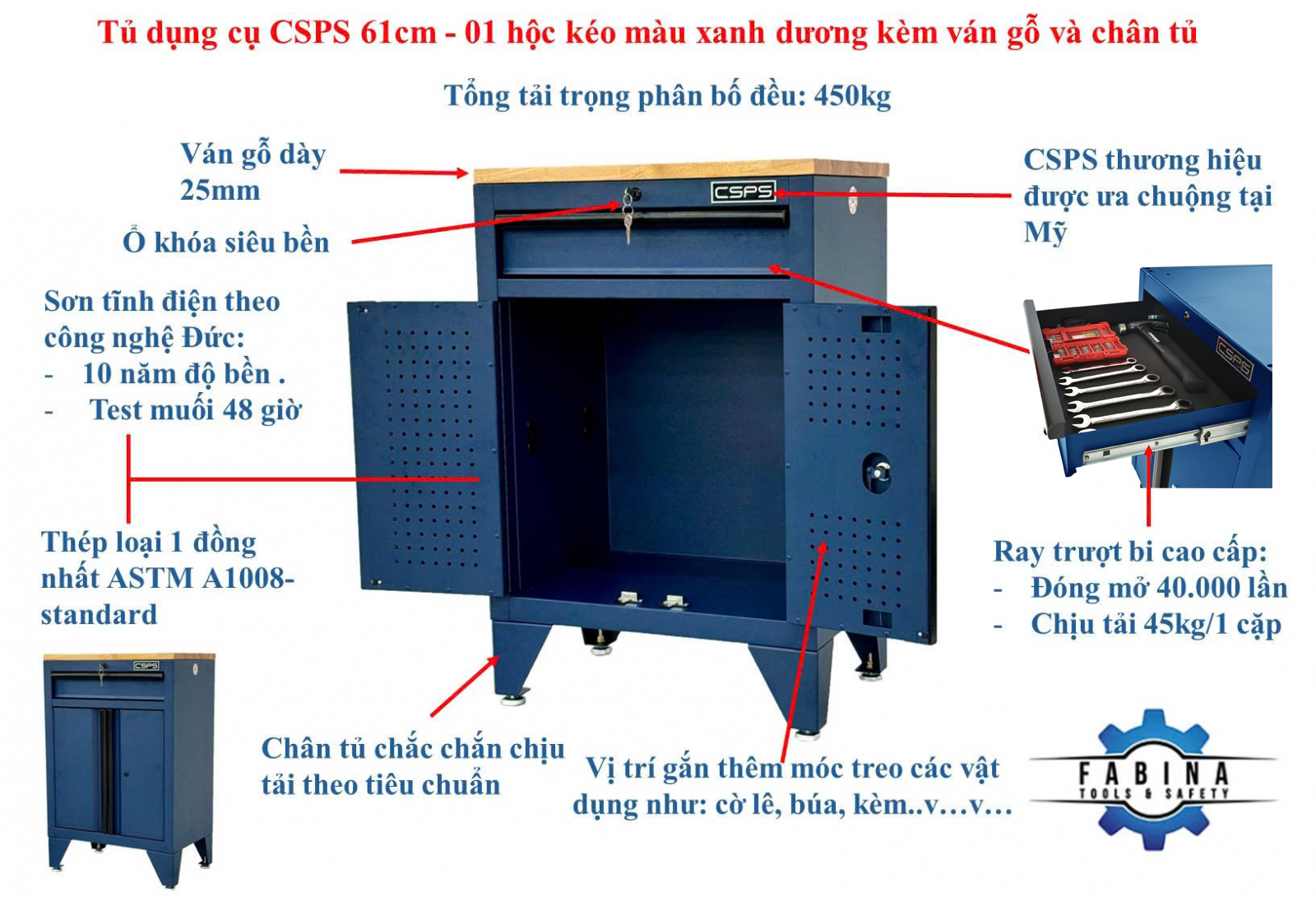 Tủ dụng cụ CSPS 61cm - 01 hộc kéo màu xanh dương kèm ván gỗ và chân tủ