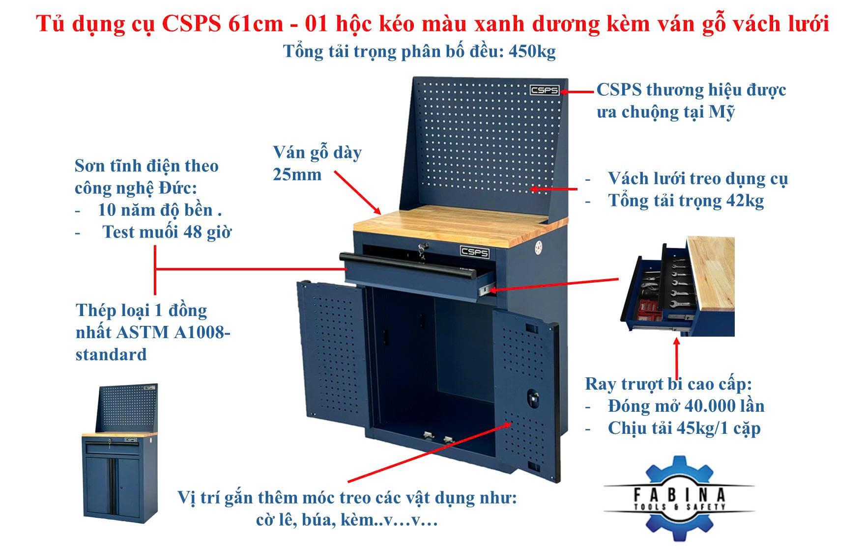 Tủ dụng cụ CSPS 61cm - 01 hộc kéo màu xanh dương kèm ván gỗ vách lưới