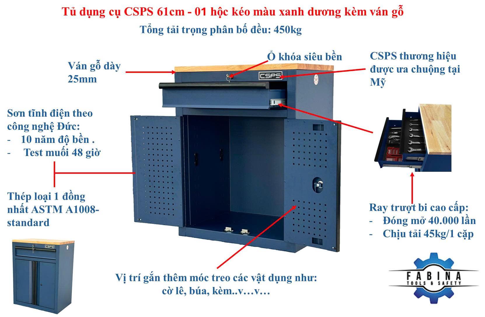 Tủ dụng cụ CSPS 61cm - 01 hộc kéo màu xanh dương kèm ván gỗ