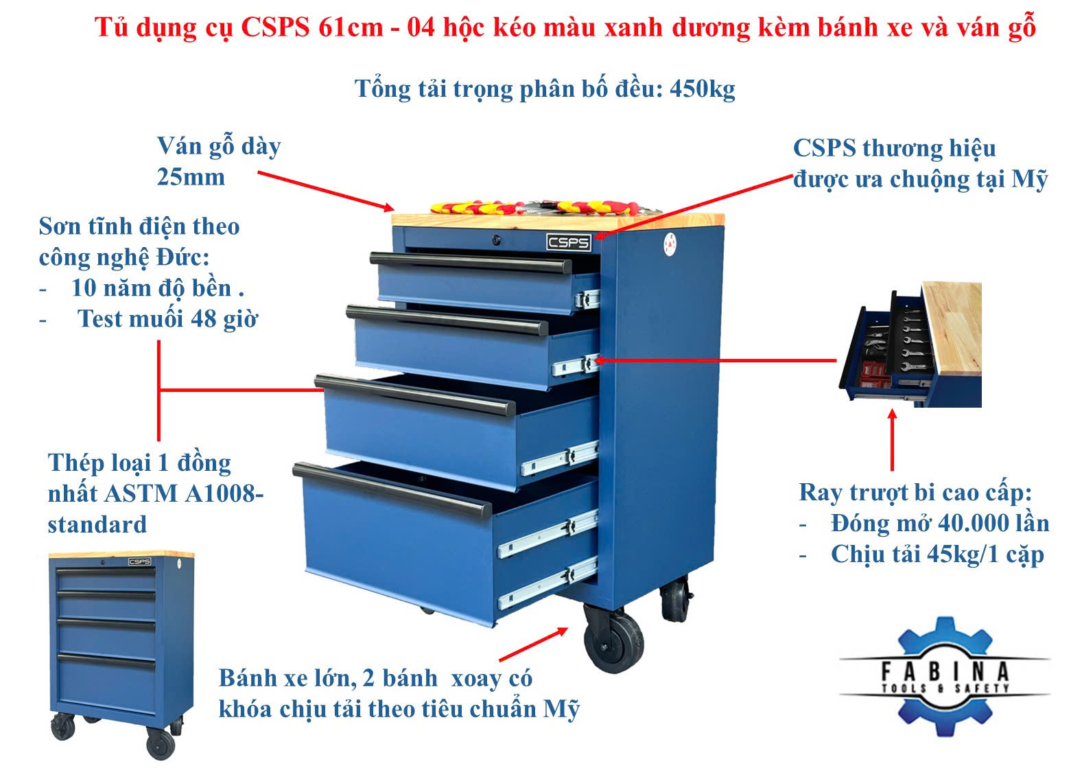 Tủ dụng cụ CSPS 61cm - 04 hộc kéo màu xanh dương kèm bánh xe và ván gỗ