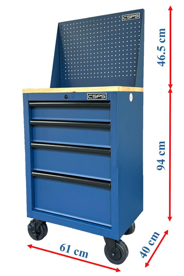 Tủ dụng cụ CSPS 61cm - 04 hộc kéo màu xanh dương kèm bánh xe ván gỗ vách lưới