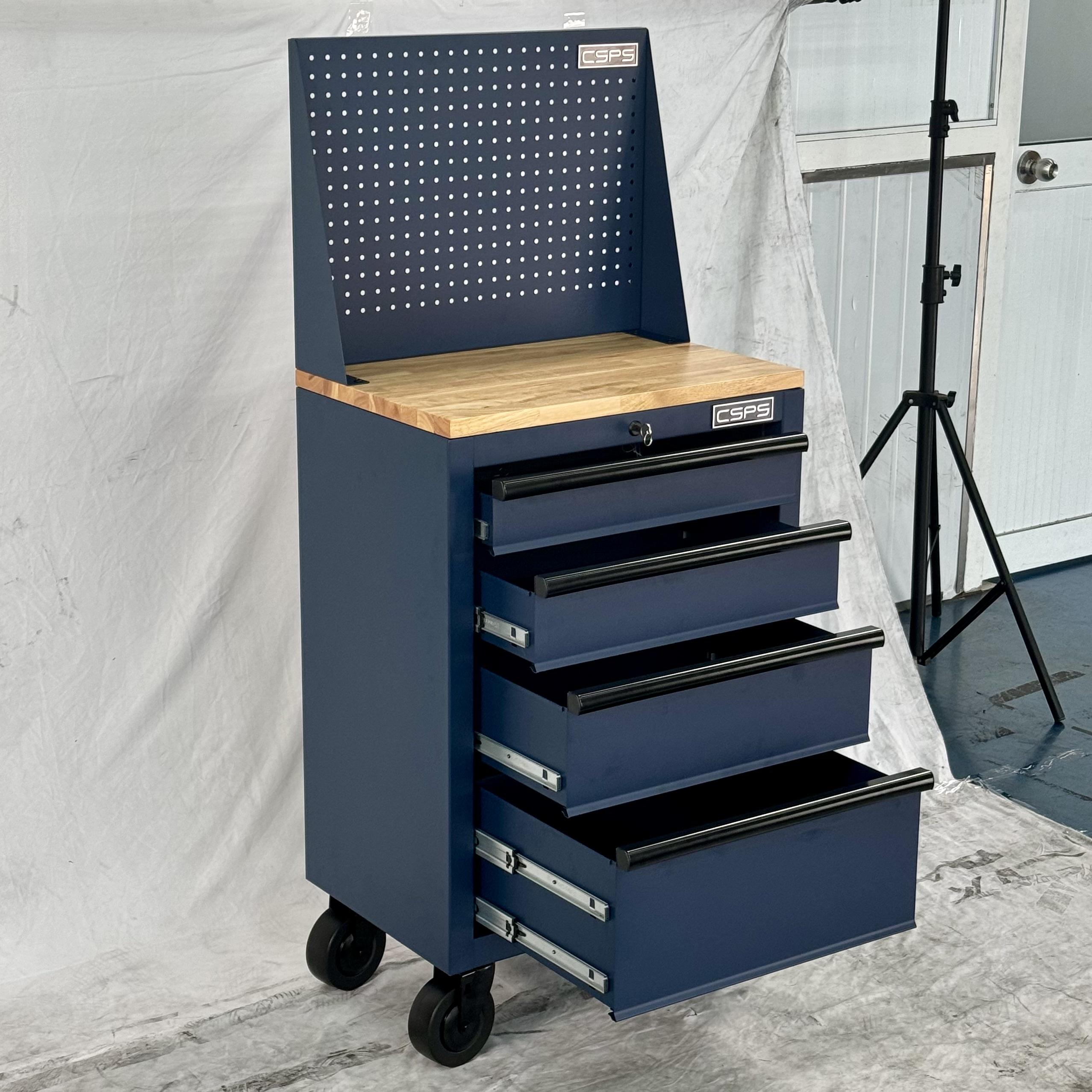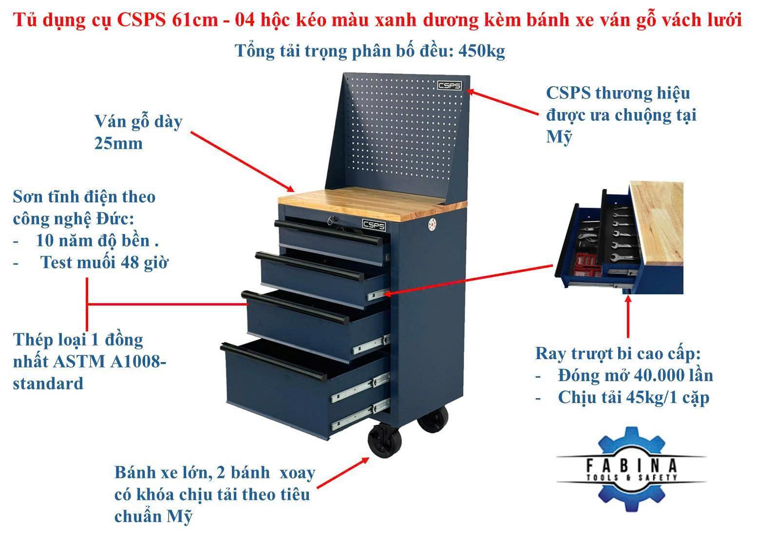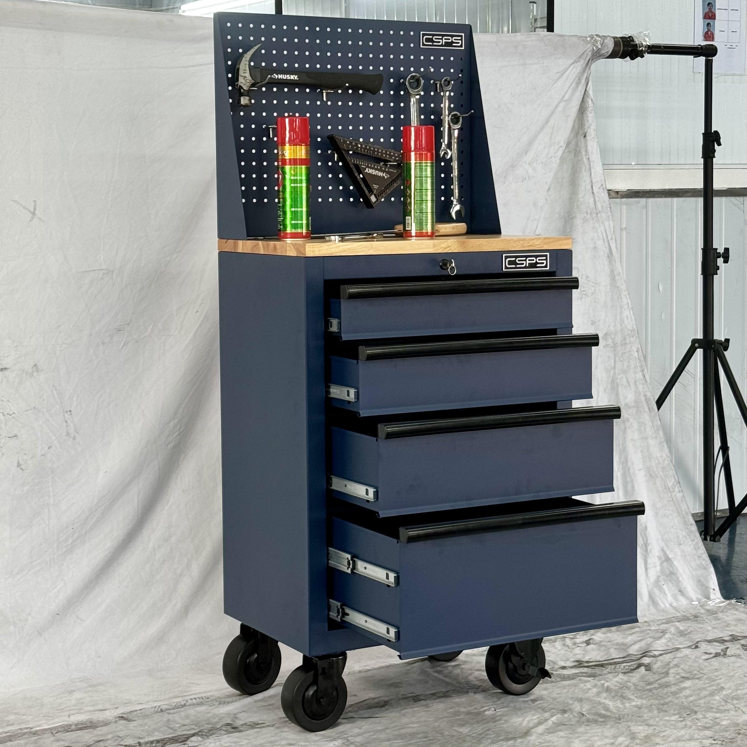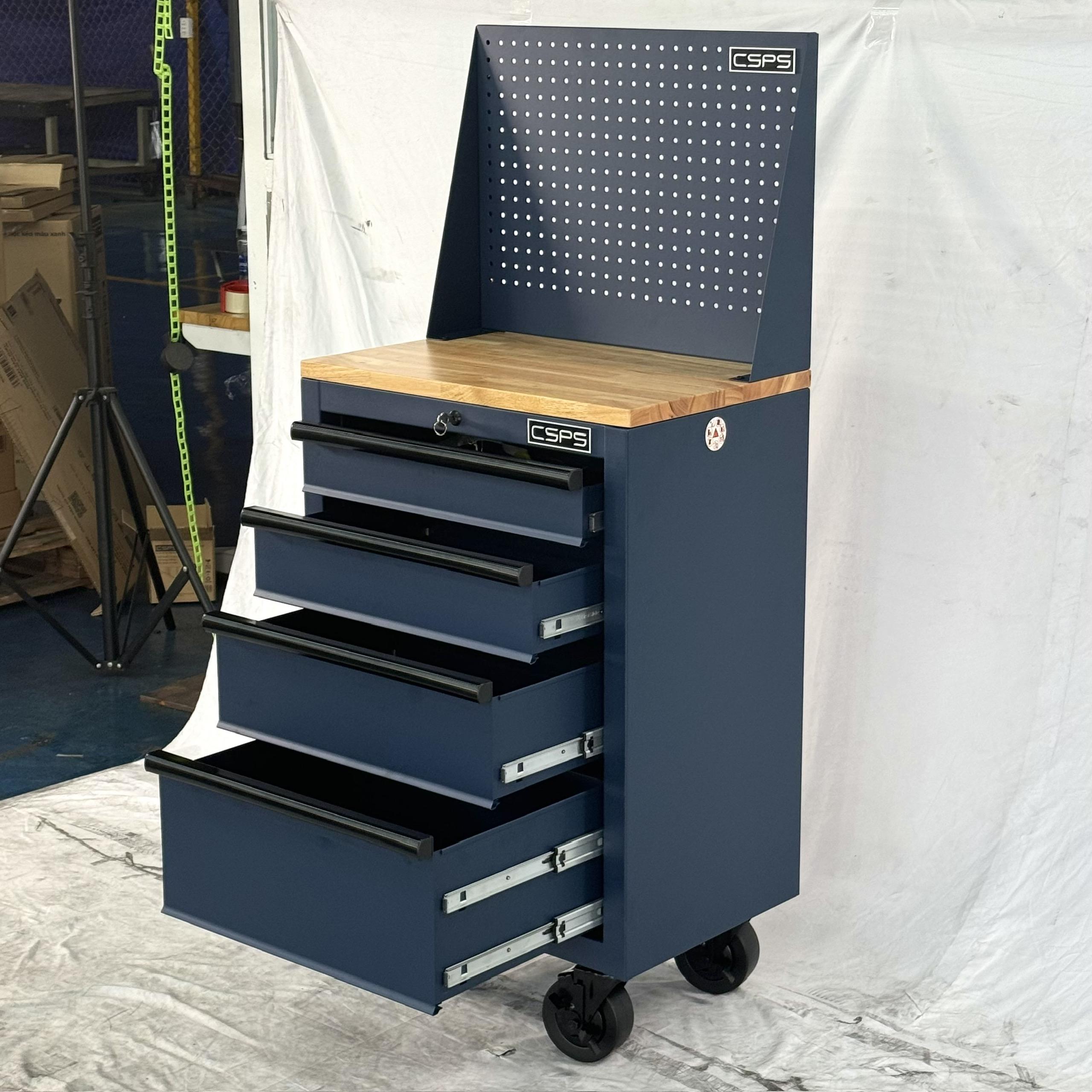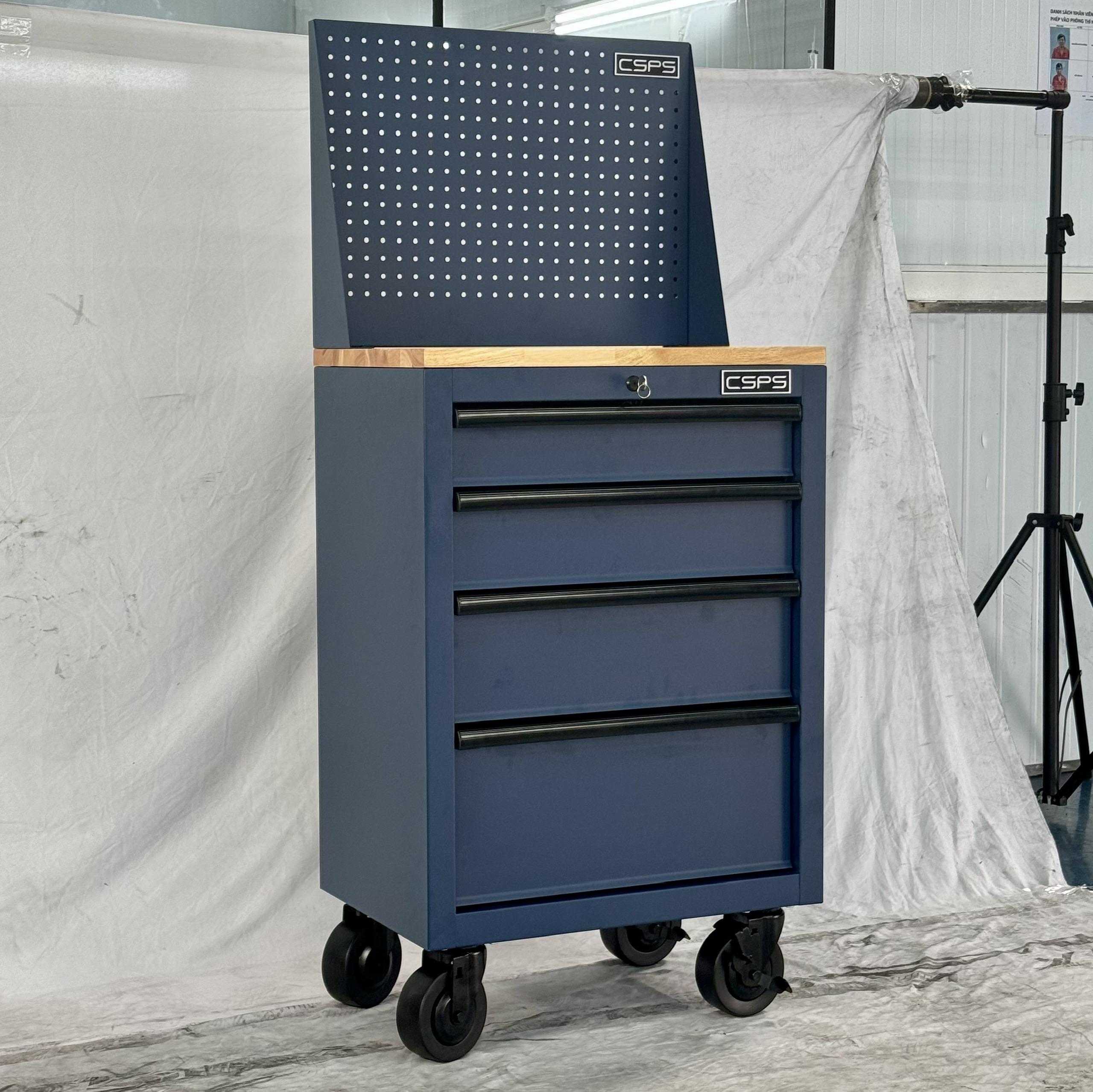 Tủ dụng cụ CSPS 61cm - 04 hộc kéo màu xanh dương kèm bánh xe ván gỗ vách lưới