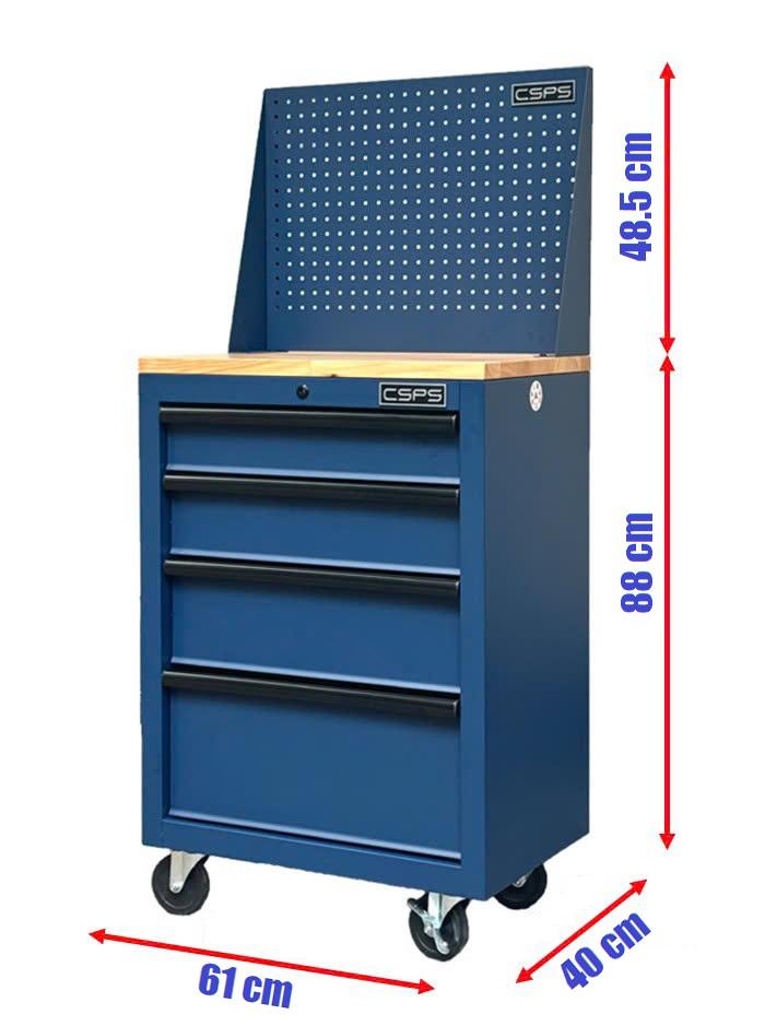 Tủ dụng cụ CSPS 61cm - 04 hộc kéo màu xanh dương mặt ván gỗ vách lưới kèm bánh xe Fbn 12cm